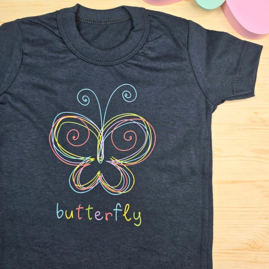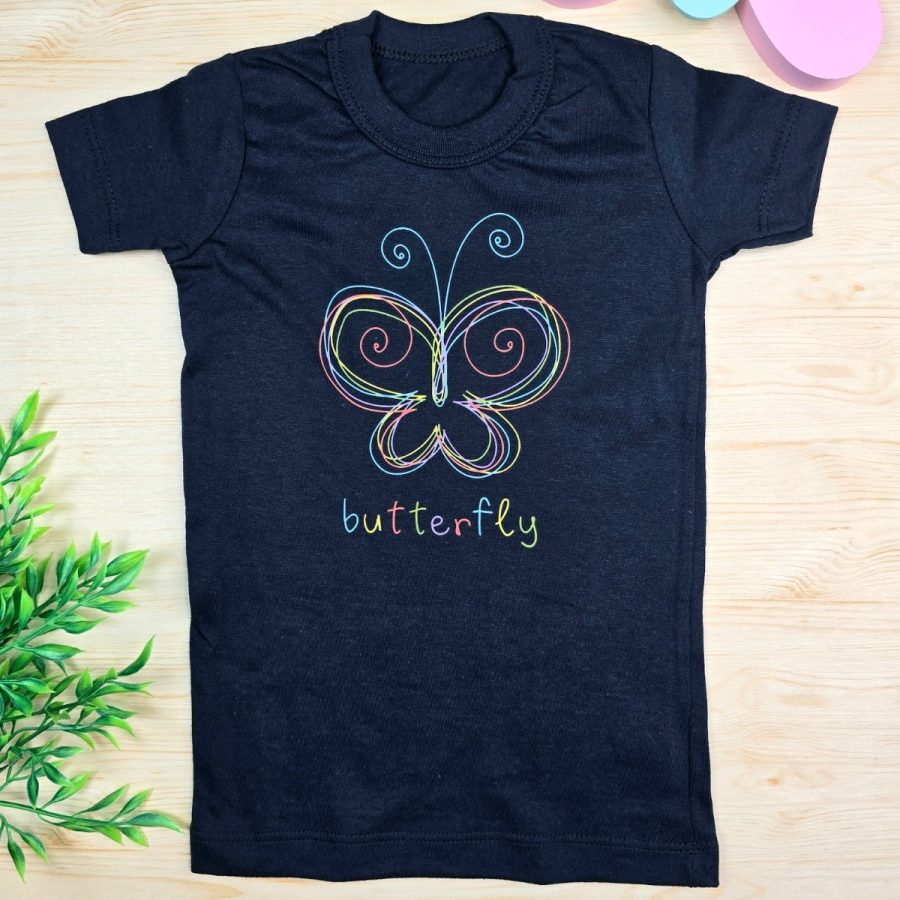 Camiseta Infantil de Menina Preta Borboleta feita em 100% Algodão da Baby&H – Conforto e Estilo para o Dia a Dia 🌈