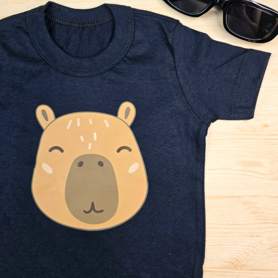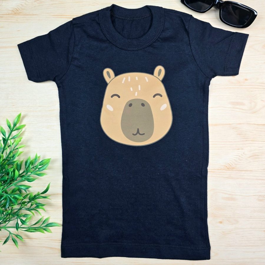 Camiseta Infantil de Menino Preta Rosto Capivara feita em 100% Algodão da Baby&H – Conforto e Estilo para o Dia a Dia 🌈