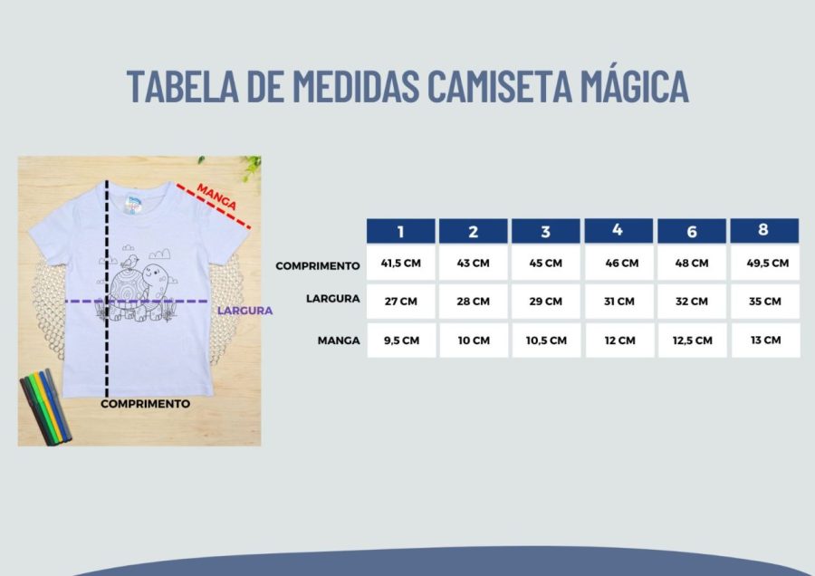 Nossa Camiseta Curta Infantil Mágica é produzida em meia malha de 100% algodão. Acompanha um Kit de 6 Canetinhas Hidrográficas. As Nossas Camisetas Mágicas são sucesso com a criançada elas podem ser pintadas com as Canetinhas que Acompanham o Kit. Após a brincadeira basta deixar de molho sozinha por 30m no sabão e em seguida fazer a lavagem normal que a tinta da Canetinha sai, podendo assim ser pintada novamente e a Brincadeira Recomeça!