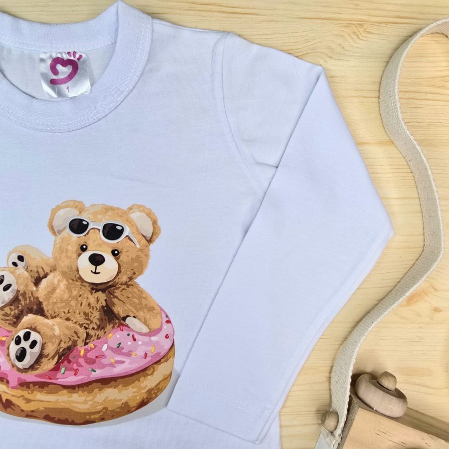 Camiseta Longa Infantil Estampada Branca – Ursinha Cupcake