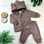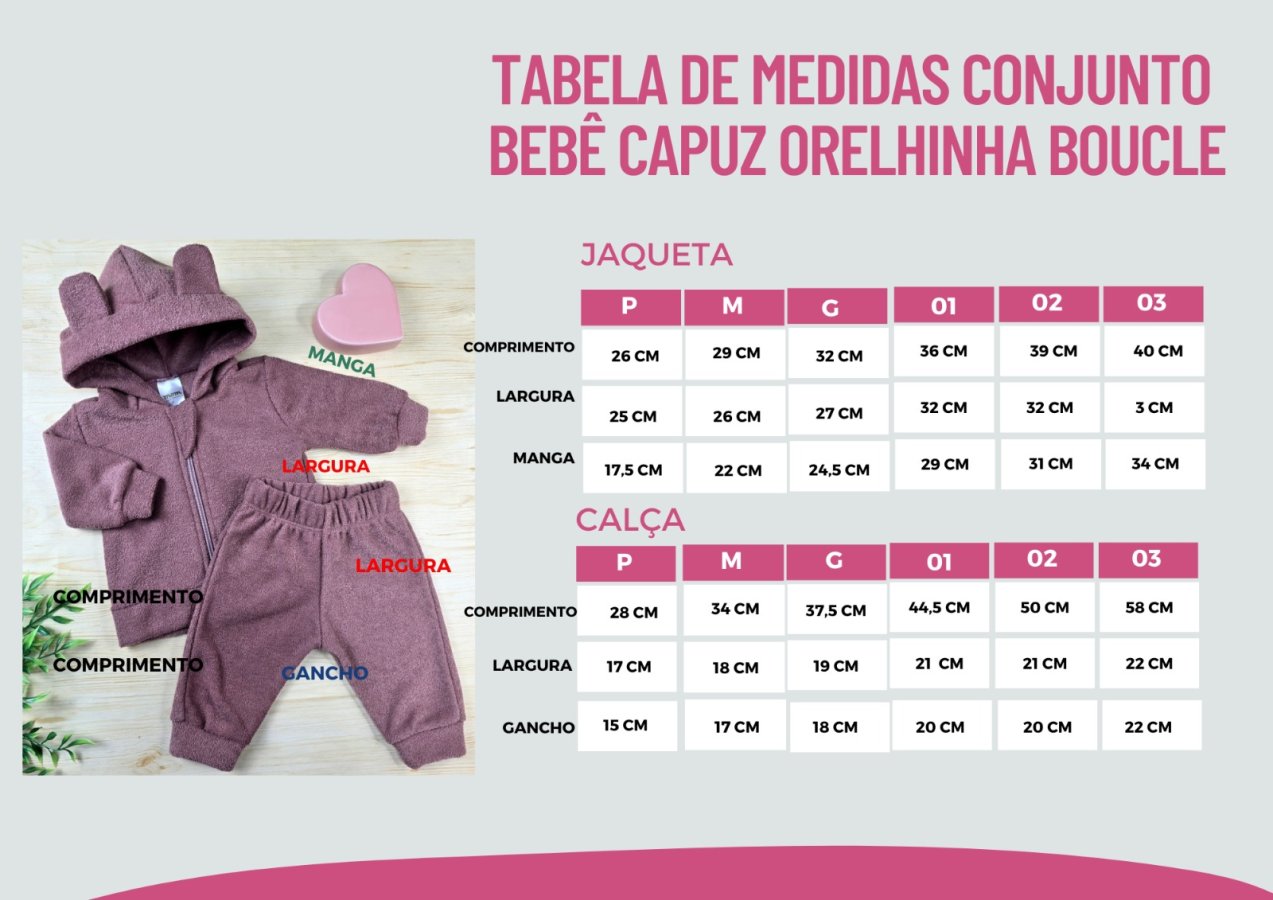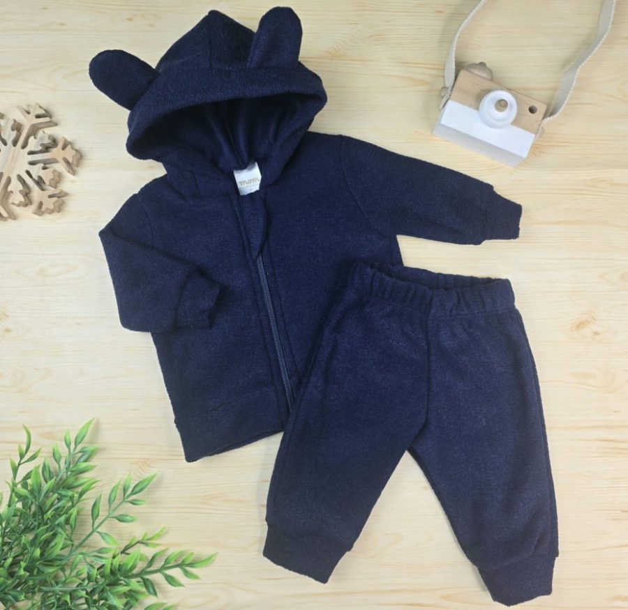 Conjunto bebê em tecido bouclé super macio e quentinho, perfeito para manter o pequeno confortável nos dias mais fresquinhos. Possui capuz com orelhinhas delicadas que dão um toque fofo e moderno ao look. Ideal para meninos e meninas, une estilo, aconchego e praticidade para o dia a dia.