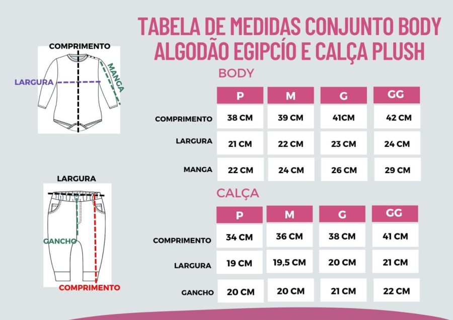 Conjunto acompanha um Body manga longa em Algodão Egípcio, bordado super fofinho deixando a peça ainda mais delicada, e uma calça de Plush quentinha com toque leve e macio.