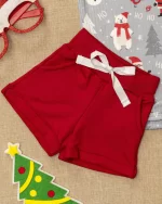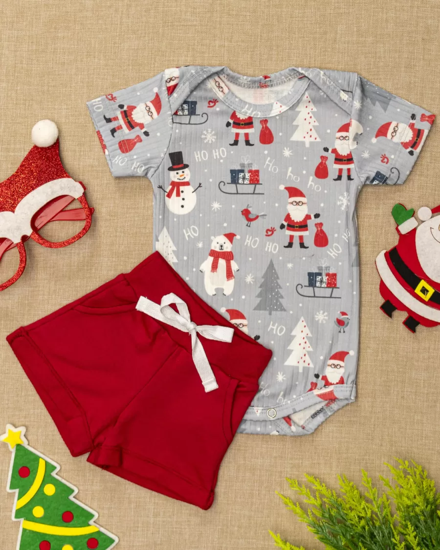 Nosso Conjunto para Bebê Canelado Body com Shorts Feminino HoHoHo é composto por um Body Manga Curta para Bebê Canelado com estampa de Natal com gola em envelope que facilita na hora de vestir na cabeça do bebê e botão de Pressão entre as pernas. E um Shorts Feminino Liso produzido em moletom careca/moletinho com Ribana no cós e elástico, barra invertida, bolso faca na lateral e cordão detalhe. Resulta em uma peça diferenciada e cheia de estilo, sempre mantendo o conforto na criança e qualidade da peça.