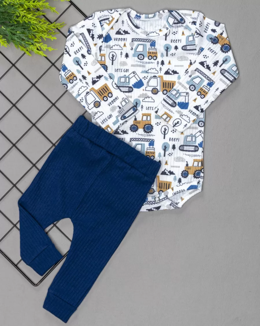 Nosso Conjunto Canelado para Bebê Máquinas é composto por um Body Manga Longa para Bebê Estampado com gola em envelope que facilita vestir na cabeça do bebê e botão de Pressão na entre perna e uma Calça Saruel Canelada Estampada com cós de elástico e punho. Resulta em uma peça super macia e confortável, é ideal para todas as ocasiões, uma peça chave no guarda roupa do seu baby trazendo praticidade para o dia a dia da mamãe.