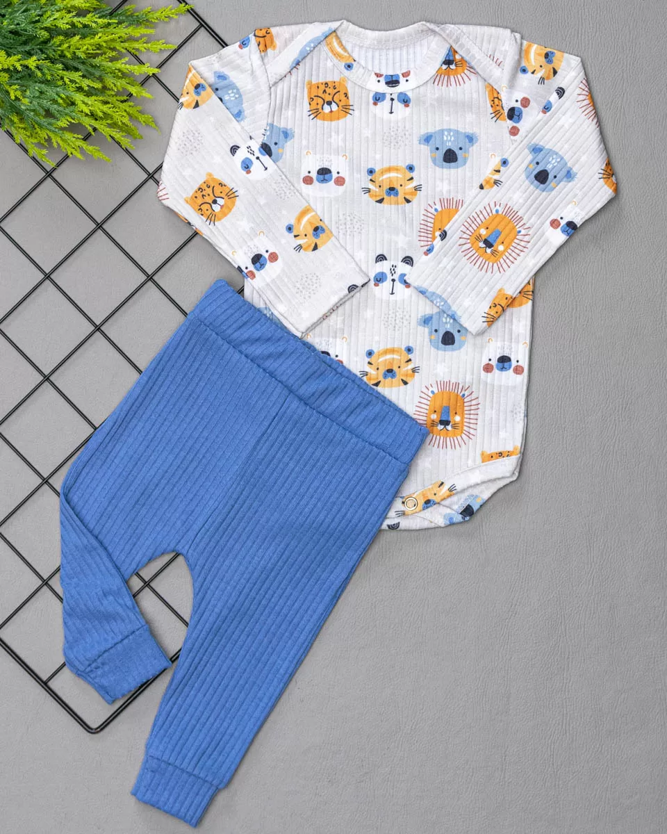 Nosso Conjunto Canelado para Bebê Reino Animal Azul é composto por um Body Manga Longa para Bebê Estampado com gola em envelope que facilita vestir na cabeça do bebê e botão de Pressão na entre perna e uma Calça Saruel Canelada Estampada com cós de elástico e punho. Resulta em uma peça super macia e confortável, é ideal para todas as ocasiões, uma peça chave no guarda roupa do seu baby trazendo praticidade para o dia a dia da mamãe.