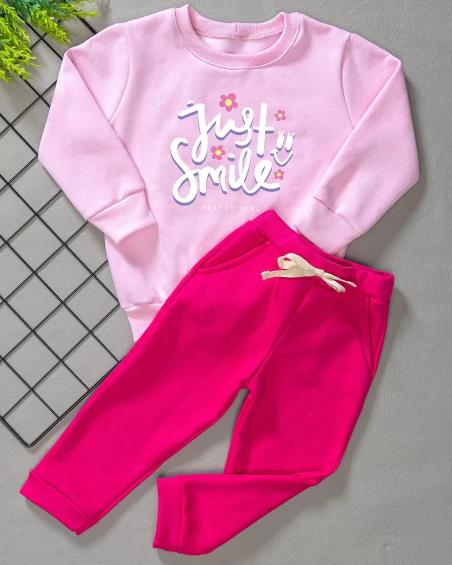 Nosso Conjunto de Moletom Rosa Just/Smile  é composto por um Moletom Produzido com Moletom Felpado ou seja, peluciado por dentro. Com Ribana na barra, nos punhos e na Gola. E uma Calça de Moletom com Bolso produzida em moletom felpado ou seja, peluciado por dentro com punhos e barra em ribana. Elastico na cintura e Cordão Fake.  Nosso conjunto é ideal para os dias de frio, para manter seu Bebê quentinho e muito confortável. Não contém elastano na sua composição.