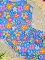 Produzido em tecido canelado leve e fresquinho, o modelo traz uma blusa regata com alcinhas finas e estampa de Azul Floral , combinando perfeitamente com o short com babado frufru na barra.