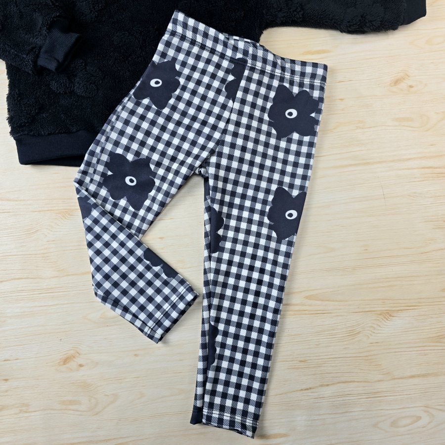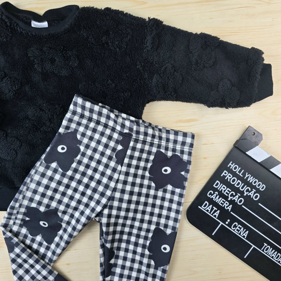 Conjunto Infantil Menina Casaco Sherpa Relevo e Legging Térmica- Preto e Xadrez Flores