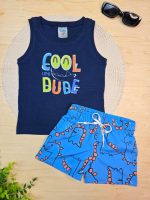 Conforto e estilo para os pequenos em qualquer ocasião! Nosso conjunto é composto por regata em algodão macio, que proporciona frescor e liberdade de movimentos, acompanhada de shorts em tactel com elastano, leve, resistente, mega confortável e com estampa divertida que garante um visual cheio de personalidade, o cós elástico com cordão fake dando um charme extra ao visual.