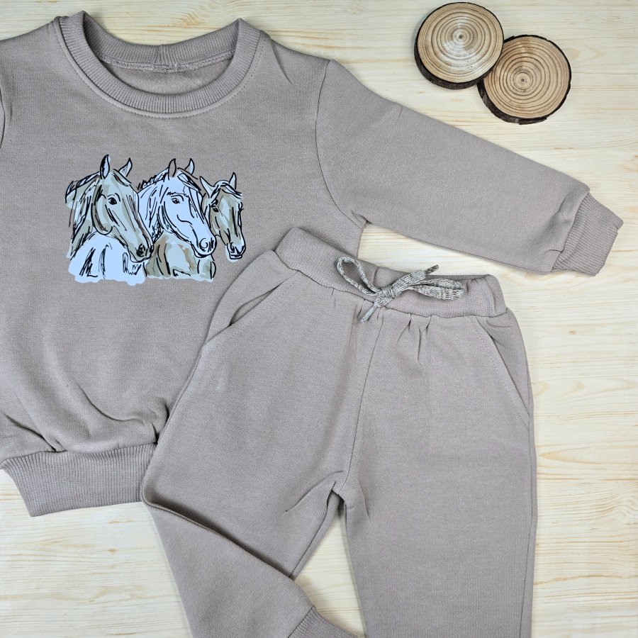 Nosso Conjunto de Moletom Bege Cavalos é composto por um Moletom Produzido com Moletom Felpado ou seja, peluciado por dentro. Com Ribana na barra, nos punhos e na Gola. E uma Calça de Moletom com Bolso produzida em moletom felpado ou seja, peluciado por dentro com punhos e barra em ribana. Elastico na cintura e Cordão Fake.  Nosso conjunto é ideal para os dias de frio, para manter seu Bebê quentinho e muito confortável.