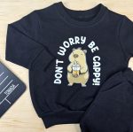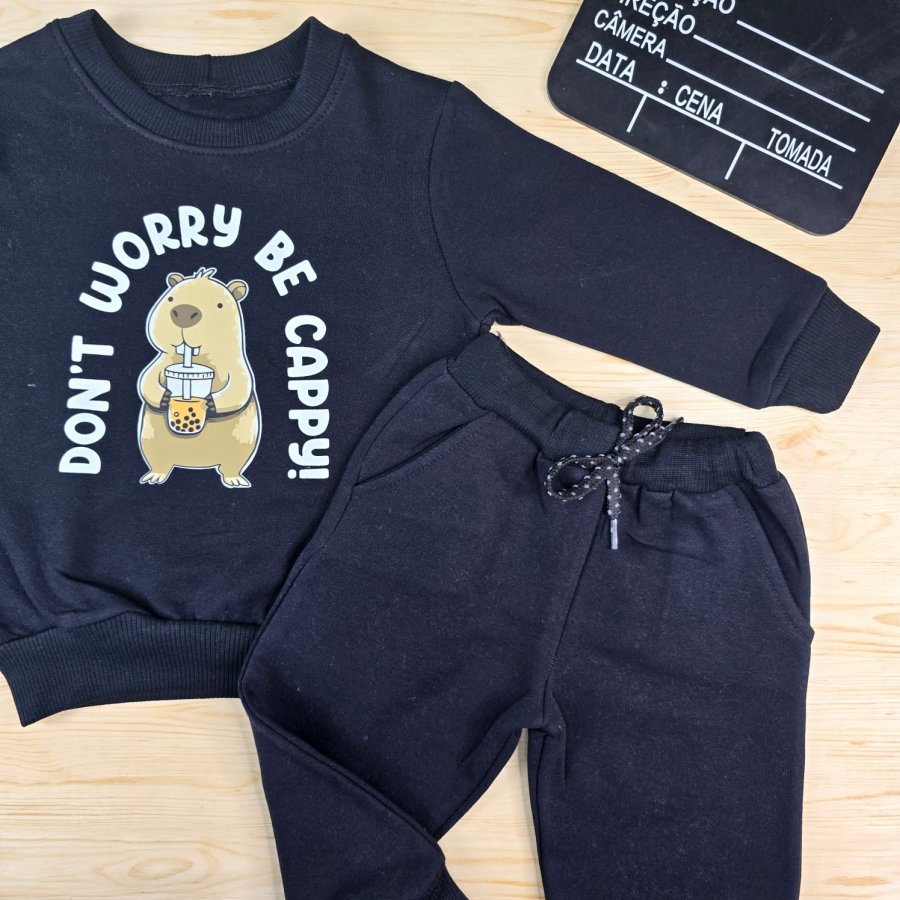 Nosso Conjunto de Moletom Infantil Preto Capivara é composto por um Moletom produzido com Moletom Felpado, peluciado por dentro. Contém Bolso Canguru na parte da Frente e Capuz na Parte de trás, com Ribana na barra e nos punhos.E por uma Calça Saruel com elástico rebatido. Nosso conjunto é ideal para os dias de frio, para manter seu Bebê quentinho e muito confortável. Não contém elastano na sua composição