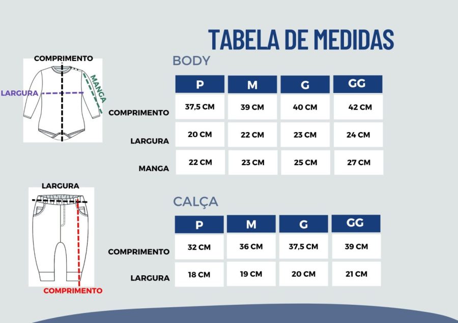 O conjunto está disponível do tamanho P ao tamanho GG.