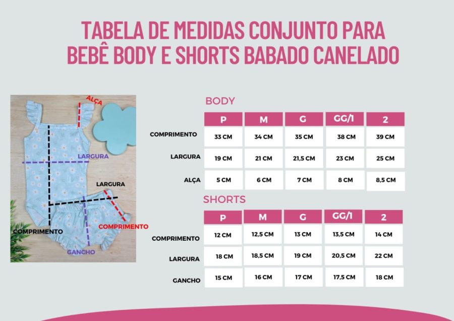 Produzido em tecido canelado leve e fresquinho, o conjunto apresenta um body com botão entrepernas, estampa Ursinha , combinando perfeitamente com o shorts que possui babado frufru na barra.