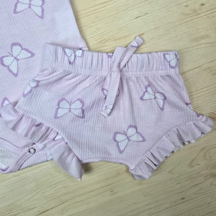 Produzido em tecido canelado leve e fresquinho, o conjunto apresenta um body com botão entrepernas, estampa Lilás Borboleta , combinando perfeitamente com o shorts que possui babado frufru na barra.