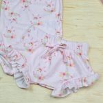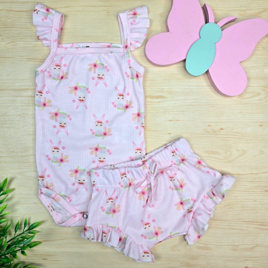 Produzido em tecido canelado leve e fresquinho, o conjunto apresenta um body com botão entrepernas, estampa Rosa Bonequinha, combinando perfeitamente com o shorts que possui babado frufru na barra.