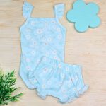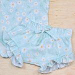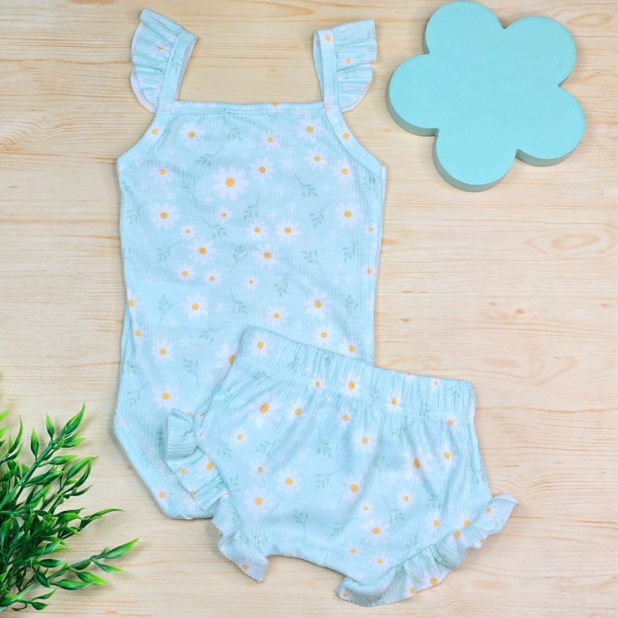 Produzido em tecido canelado leve e fresquinho, o conjunto apresenta um body com botão entrepernas, estampa Verde Margarida, combinando perfeitamente com o shorts que possui babado frufru na barra.