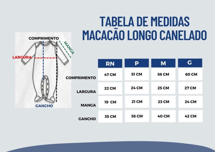 Macacão longo de zíper com proteção interna e externa para não machucar e facilitar na hora de vestir.