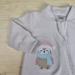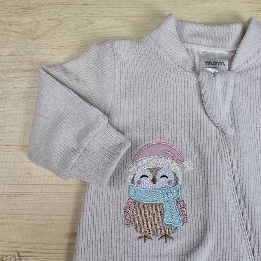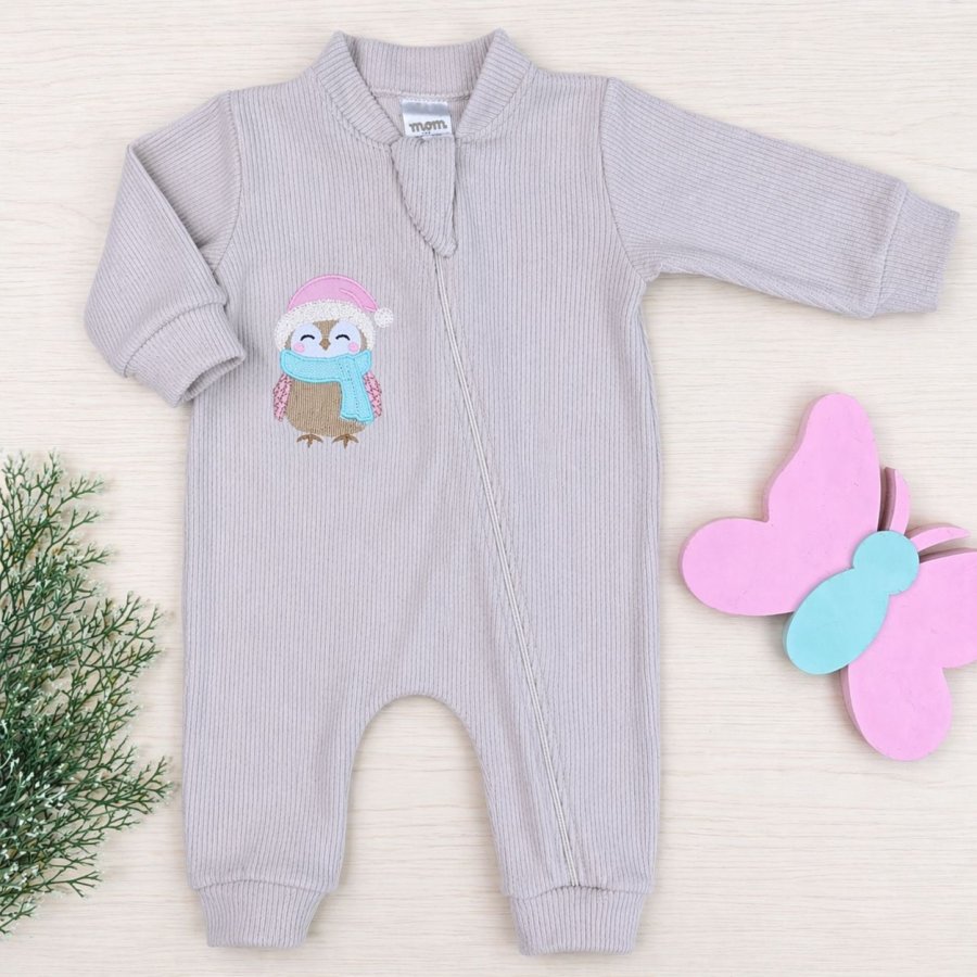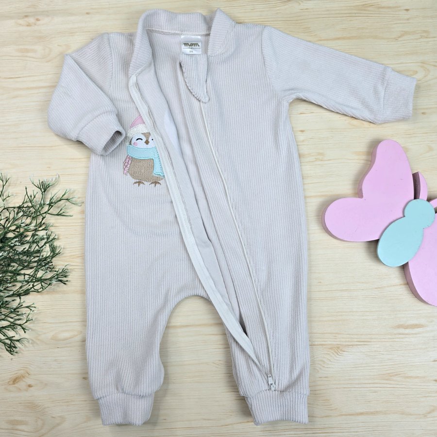 Macacão Bebê Menina Veludo Canelado Bordado Bege – Corujinha