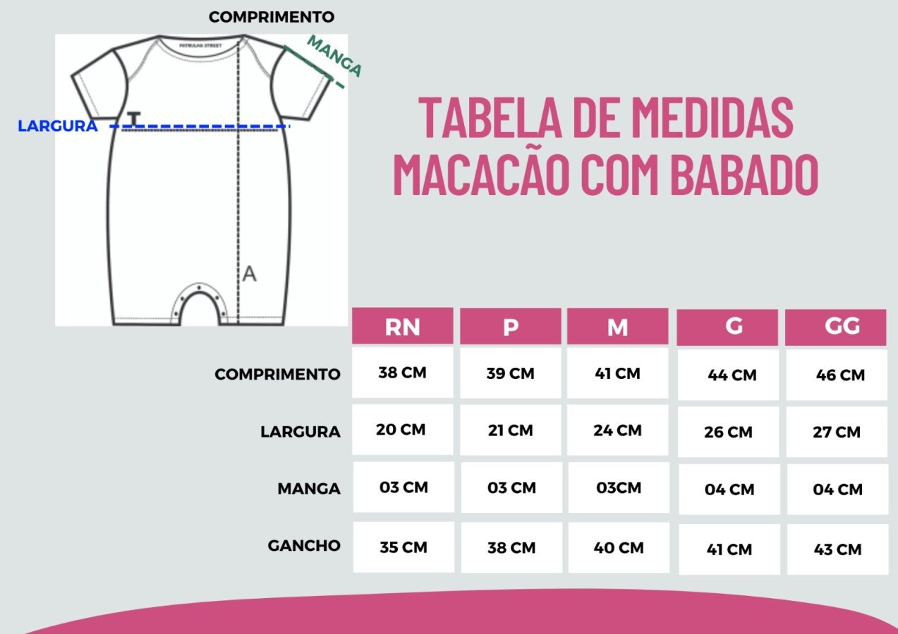 Fechamento com botões entrepernas e na altura do pescoço para facilitar a troca.