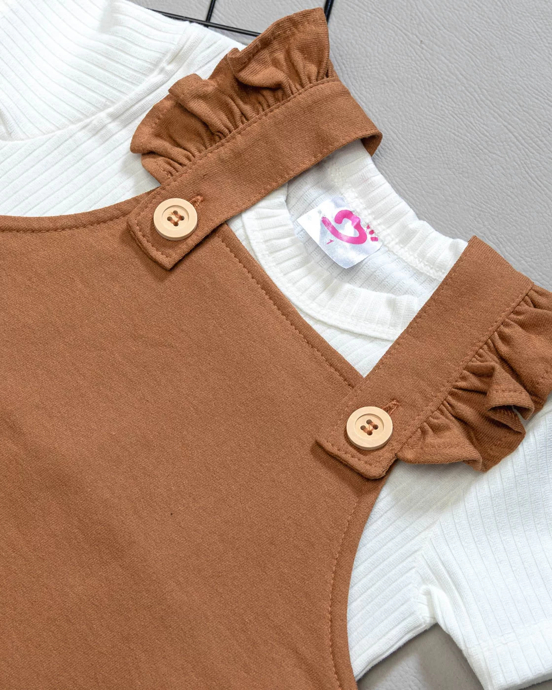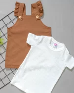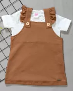 Conjunto Salopete Babado Camel c/ Camiseta Curta Canelada Off