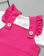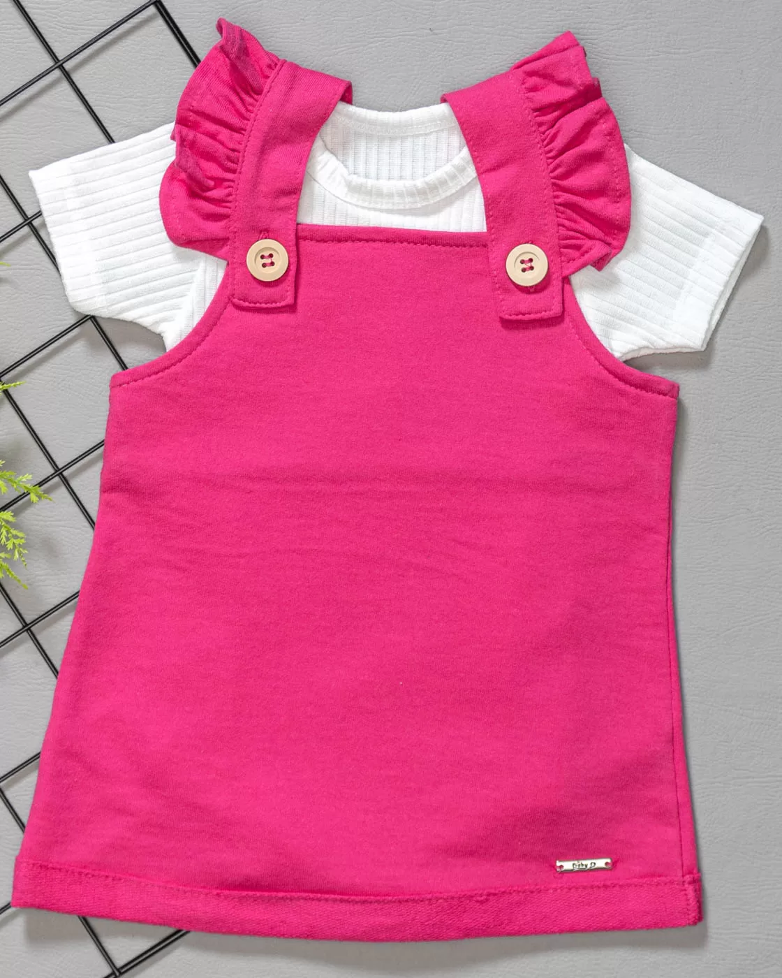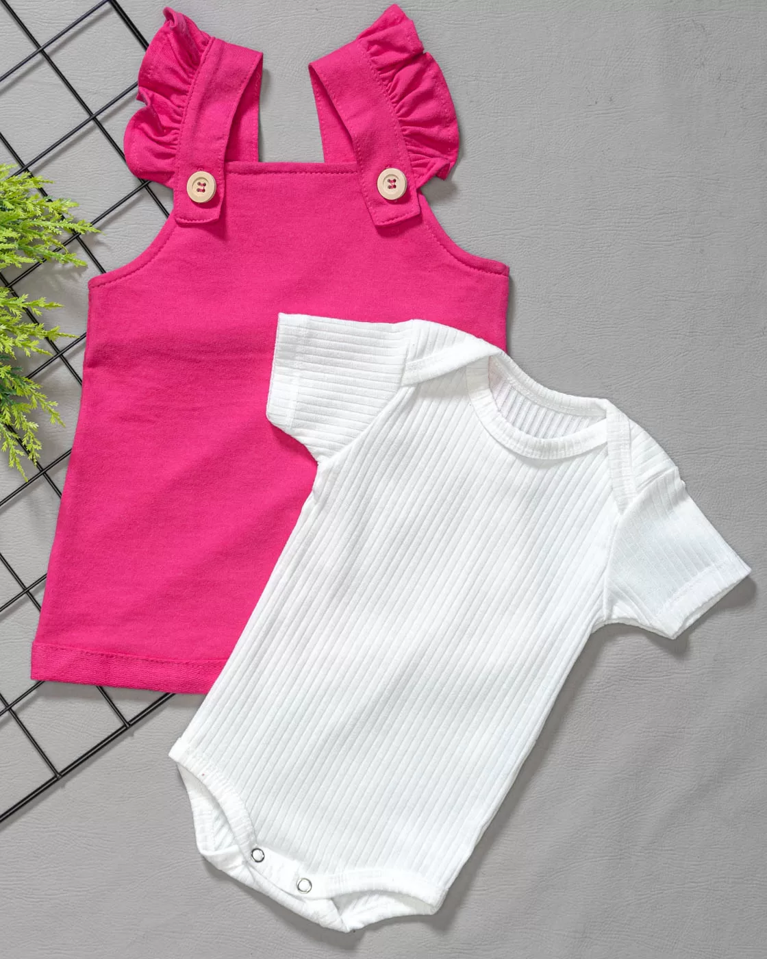Conjunto Salopete Babado Rosa C/ Body Curto Canelada Off
